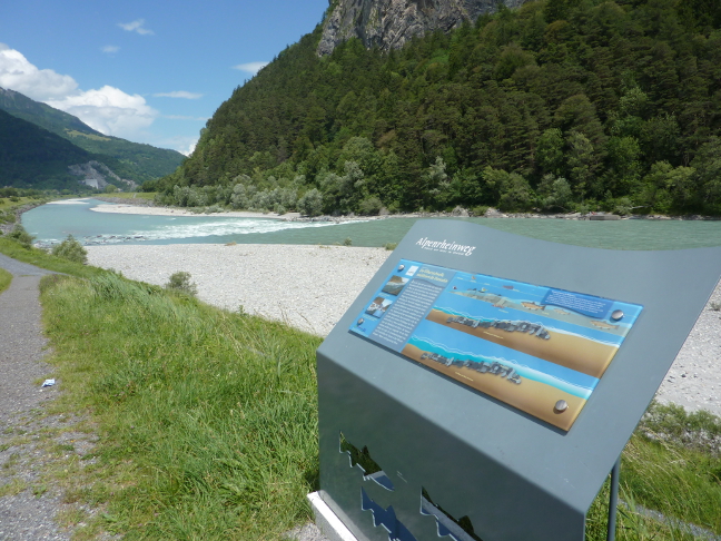 Der Alpenrhein hat sich ein weites Tal geschaffen, aber er ist gezähmt worden. Ein Deich begrenzt sein Bett, das er noch nicht einmal ausfüllt, als ich entlang fahre. Hier ist sicher eine der langweiligen Passagen. Wer genügend Kraft in den Beinen hat, kann sich mit Abstechern in die Berge Abwechslung verschaffen