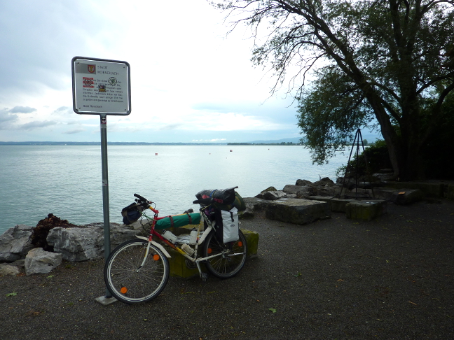 Auf dieser Passage ist es drückend heiß. Ich erwarte ständig ein Gewitter. Als ich den Bodensee erreiche, öffnen sich schließlich die Himmelsschleusen. Ich habe Glück, einen Unterstand zu finden.
