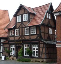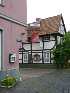 Erst am folgenden Tag, der erst mal war wie die vorigen, erreicht mich der Regen und zwar in dem Moment, in dem ich nach Nienburg hinein fuhr. Trotz dieser nasser Begrüßung gefiel es mir hier besonders gut. Die Buchung des Hotels erwies sich als Panne - ich war erst für den nächsten Tag vorgesehen und es war nichts frei. So landete ich ein einem hübschen Haus mitten im Ort, "Dat wählige Rott". Ein originelles, liebevoll ausgestattetes Hotel, das von einer drahtigen, freundlichen, älteren Dame geführt wurde.
